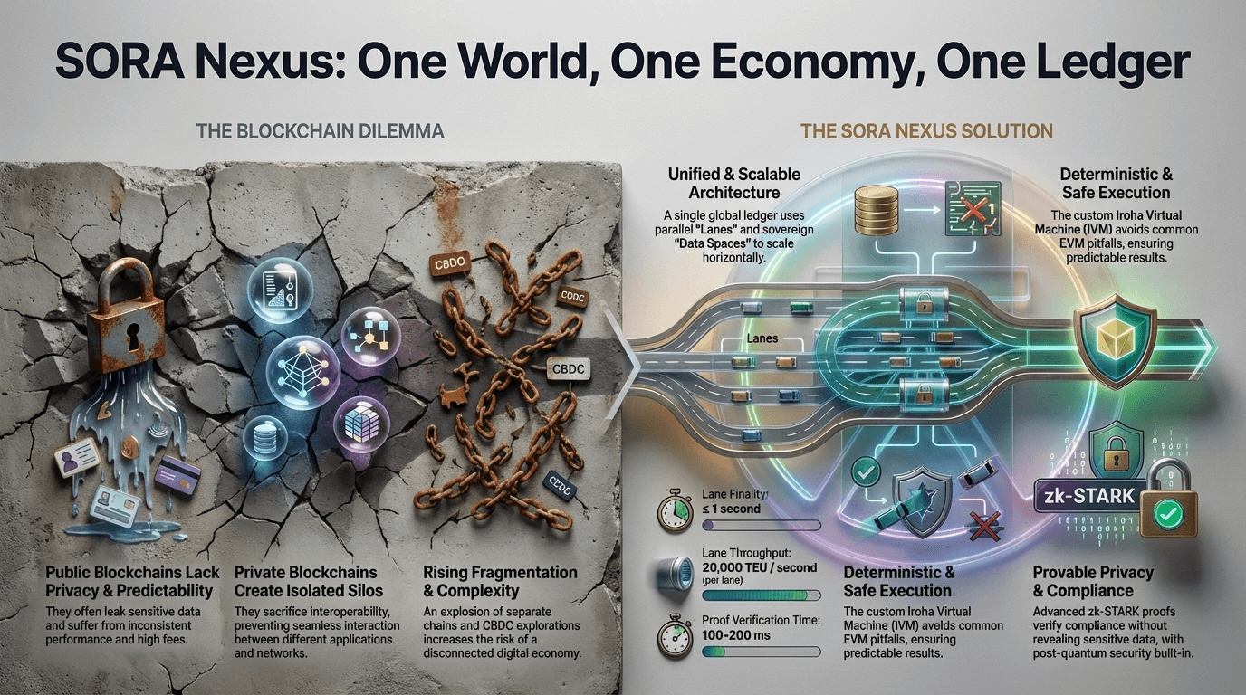 SORA Nexus addresses these by operating as one ledger with many data spaces, each with its own policy and privacy rules, but all sharing: